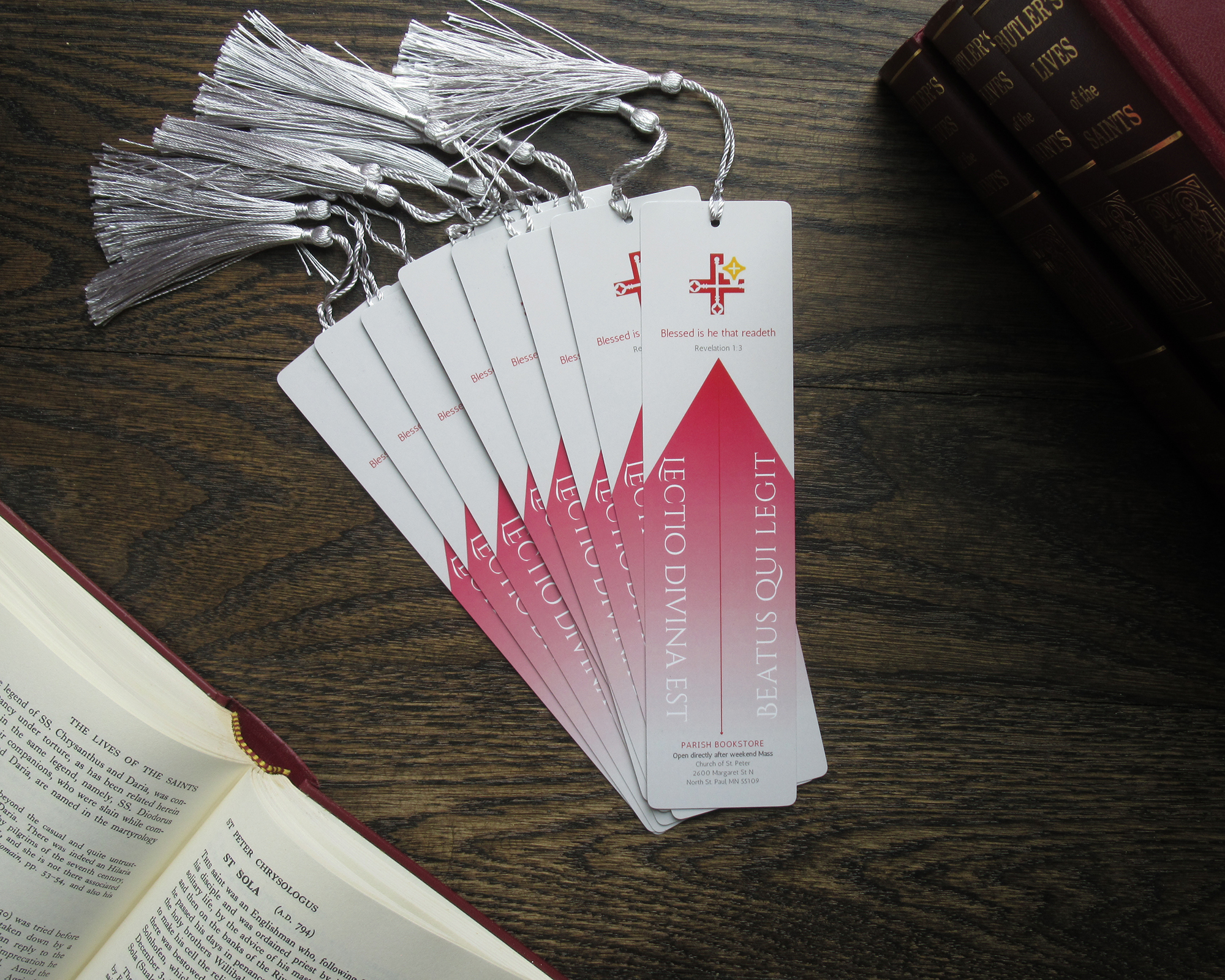 Because our parish appreciates a meaningful connection to the Latin language in our Faith, I decided to create bookmarks and a rubber stamp to reflect this connection.